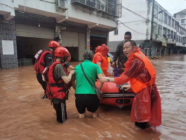 四川省渠县贵福镇纪检干部与应急抢险队员一道,组织协调转移受灾群众。(四川省渠县纪委监委 陈茂峰 摄)