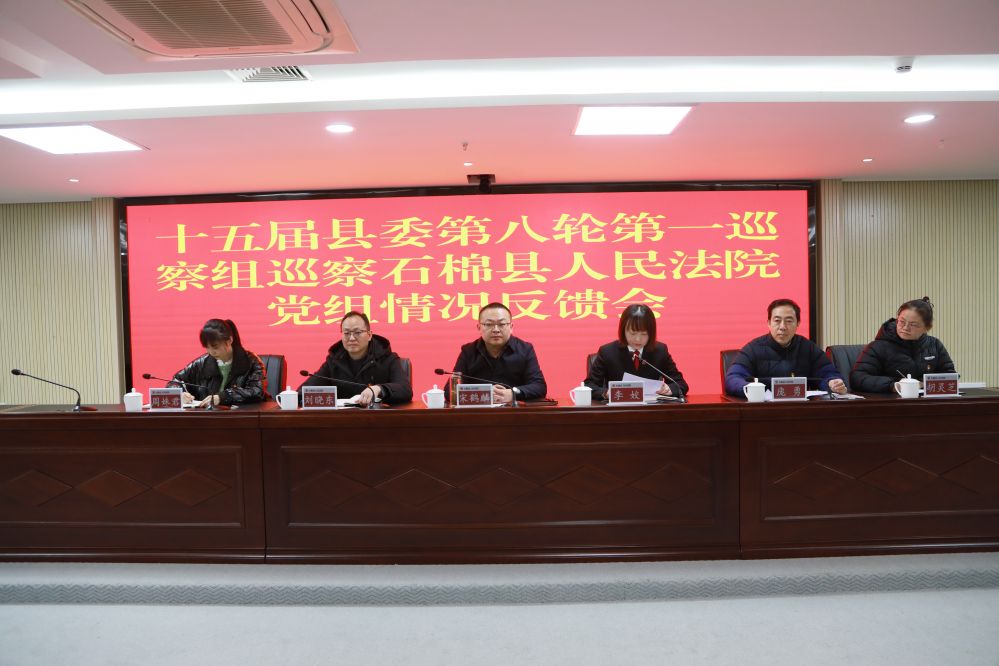 根据省委巡视统一部署、县委巡察工作统一安排,2026年2月2日,十五届县委第八轮第一巡察组巡视联动巡察石棉县人民法院党组情况反馈会议召开。会前,县委第一巡察组组长庞勇主持召开与县法院党组书记、院长李姣的单独反馈会,传达了县委书记周船关于巡察整改工作的重要讲话精神。反馈会上,县委常委、政法委书记宋鹤麟出席会议并讲话,县委巡察工作领导小组成员、县纪委副书记、县监委副主任刘晓东提出整改要求,庞勇通报了巡察情况和反馈意见,李姣主持会议并作表态发言。县委第一巡察组副组长周姝君、胡灵芝及相关人员和县法院全体干警参加。